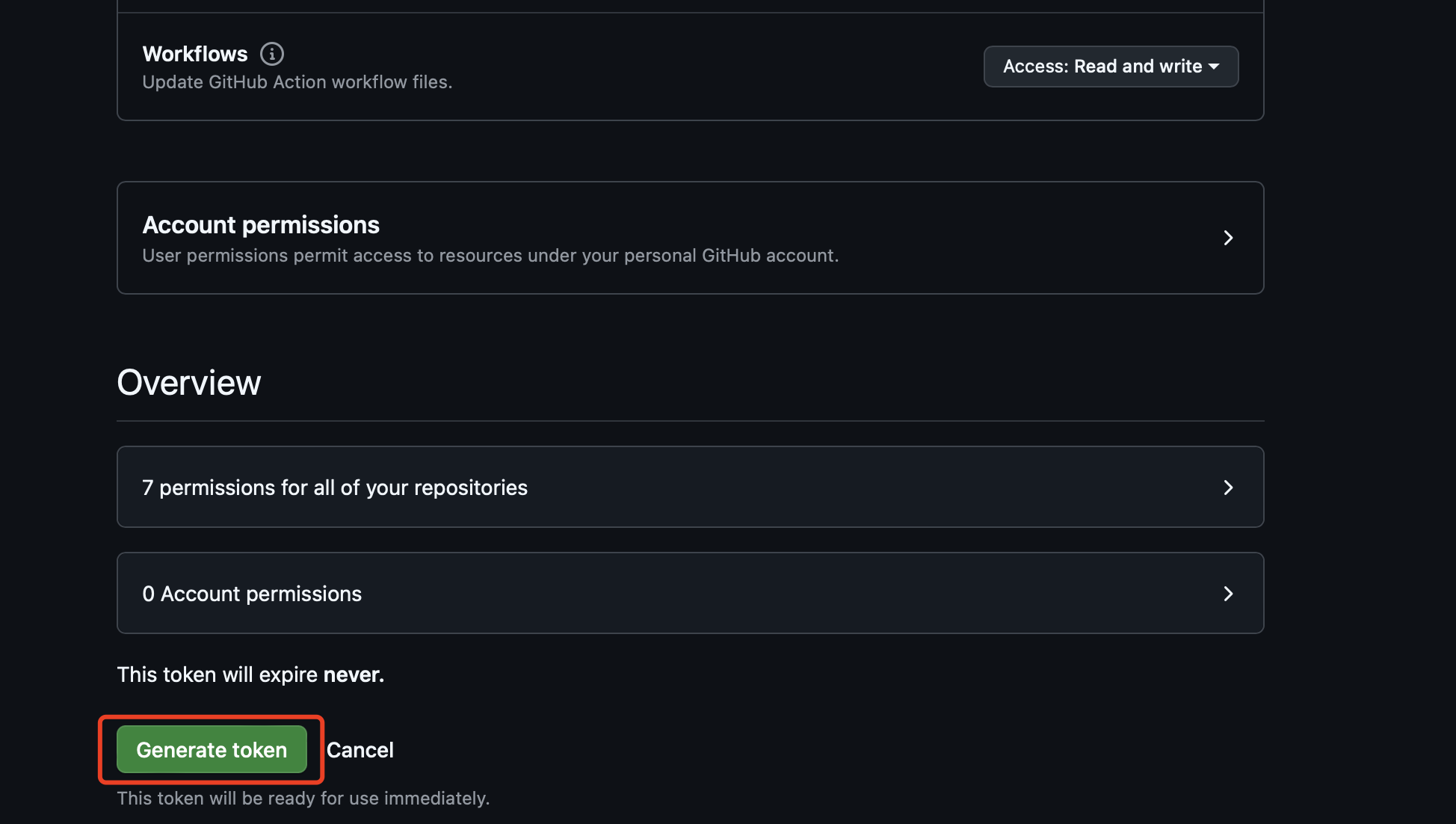 然后点击最底部的 Generate token 就可以拿到 token 了: